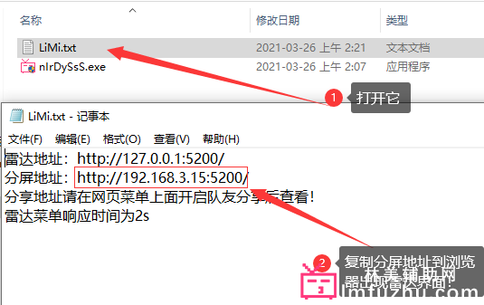 进入训练场,然后手机或者平板连上WiFi,然后在辅助的目录下找到 LiMi.txt ( 有的是 LiMI ) 然后打开他,复制分屏地址到浏览器打开!就会出现辅助界面了!