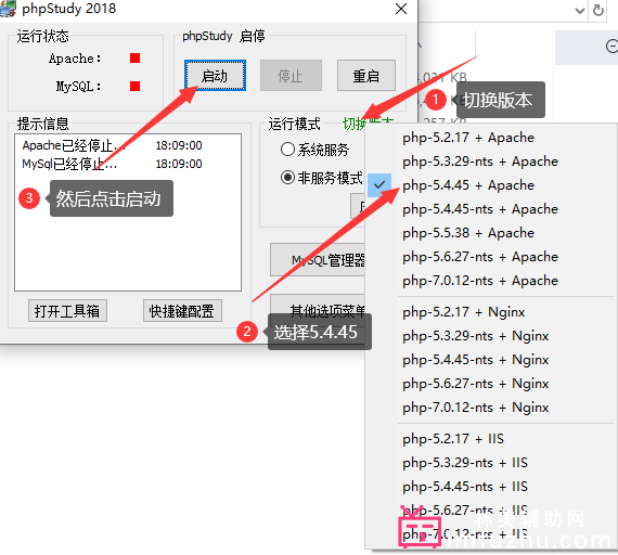 然后按照以下图片这个说明选择5.4.45版本,然后启动!